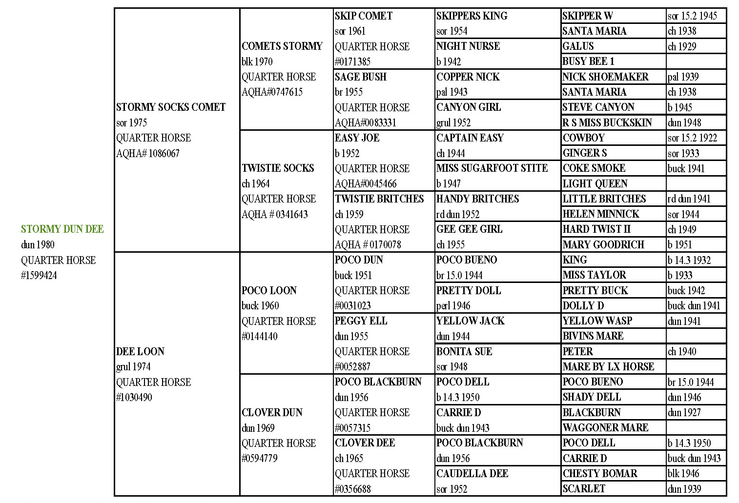 The sire of Stormy Dun Dee was Stormy Socks Comet by Comets Stormy by Skip Comet by Skipper’s King. Skipper’s King was sired by Skipper W by Nick Shoemaker, and he was out of Santa Maria by Plaudit. The dam of Comets Stormy was Sage Bush by Copper Nick by Nick Shoemaker, and he was out of Santa Maria. This makes Comet’s Stormy line-bred with a breeding pattern of 2 x 2 to the ¾ brother’s Skipper’s King and Copper Nick. The dam of Stormy Socks Comet was Twistie Socks by Easy Joe by Captain Easy by Cowboy P-12. Cowboy P-12 was the sire of Hired Girl, the dam of Skipper W, giving the pedigree of Stormy Socks Comet a breeding pattern of 5 x 4 to Cowboy P-12, who was sired by Yellow Jacket, a ranch sire for the Waggoner Ranch and some others.